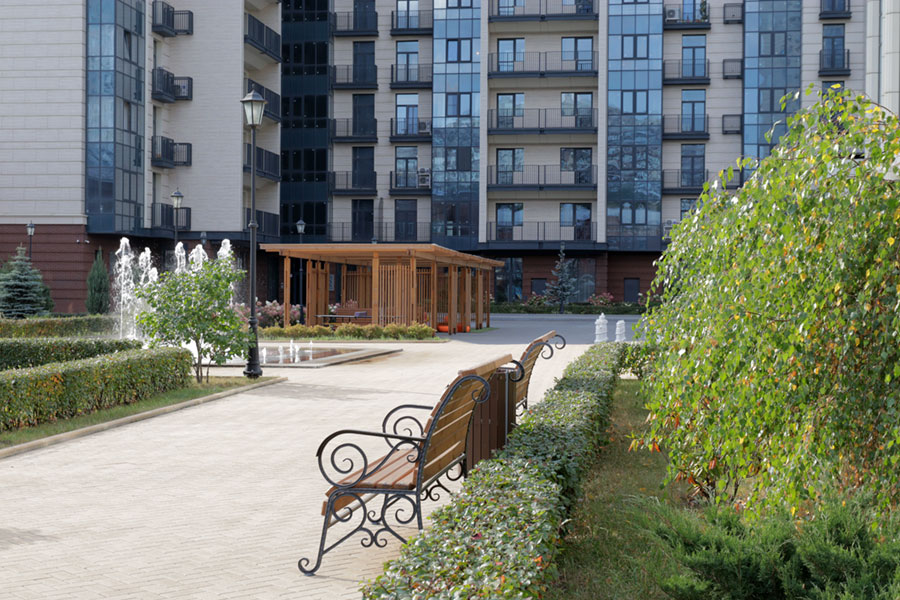На огороженной и охраняемой территории комплекса реализована концепция «двор без машин», обустроены зоны отдыха с фонтаном, который красивой подсвечивается в вечернее время и ночное время, детские городки и спортивные площадки, оснащенные комфортным покрытием и современным оборудованием